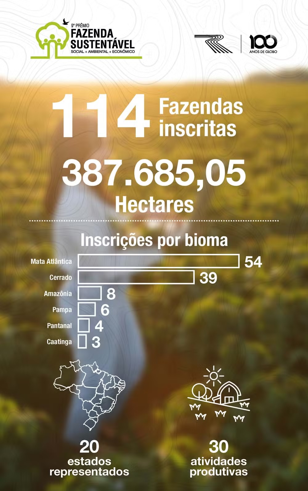 Neste ano, 114 propriedades, localizadas em seis diferentes biomas, concorreram ao Fazenda Sustentável, um recorde na história do prêmio. A edição 2025 recebeu inscrições de estabelecimentos de 20 estados. Minas Gerais, com 24 inscrições, foi a unidade da federação com o maior número de concorrentes. Depois, pela ordem, ficaram Mato Grosso do Sul e São Paulo, ambos com 22, Rio Grande do Sul (nove), Paraná (sete) e Mato Grosso (seis).