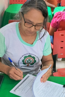 Foto: Maria Josefa Machado Neves, presidente da AMPPF assinando o contrato PNAE com a Secretaria de Educação de São Félix do Xingu- Chamada Pública 2026.